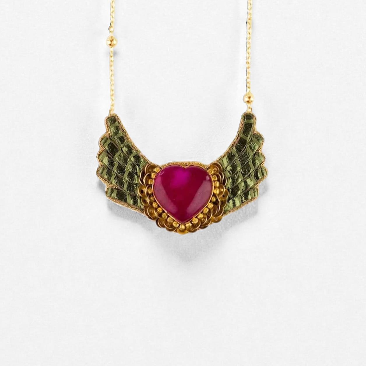 La collection Angel occupe une place à part dans l’univers créatif de Nahua. C’est en effet le tout premier thème qui a introduit la broderie sur cuir, une technique unique inventée par Isabelle et perfectionnée avec l’atelier indien. Cette innovation audacieuse a permis de marier la noblesse du cuir à l’éclat des fils métallisés, donnant naissance à des bijoux et accessoires au caractère affirmé.