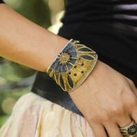 Le bangle Apollon Apache Metallic impose une présence forte au poignet. Structure rigide, fils métallisés et strass créent un bijou puissant, pensé comme une pièce centrale.