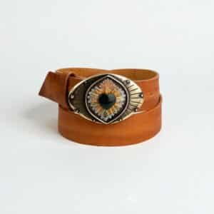 Ceinture en cuir avec une applique en acier inoxydable et anti-allergène. Bijou sacré-cœur brodée à la main en fil métallisé, en laiton et sequins avec au centre une pierre semi précieuse en forme de coeur sertie de laiton.