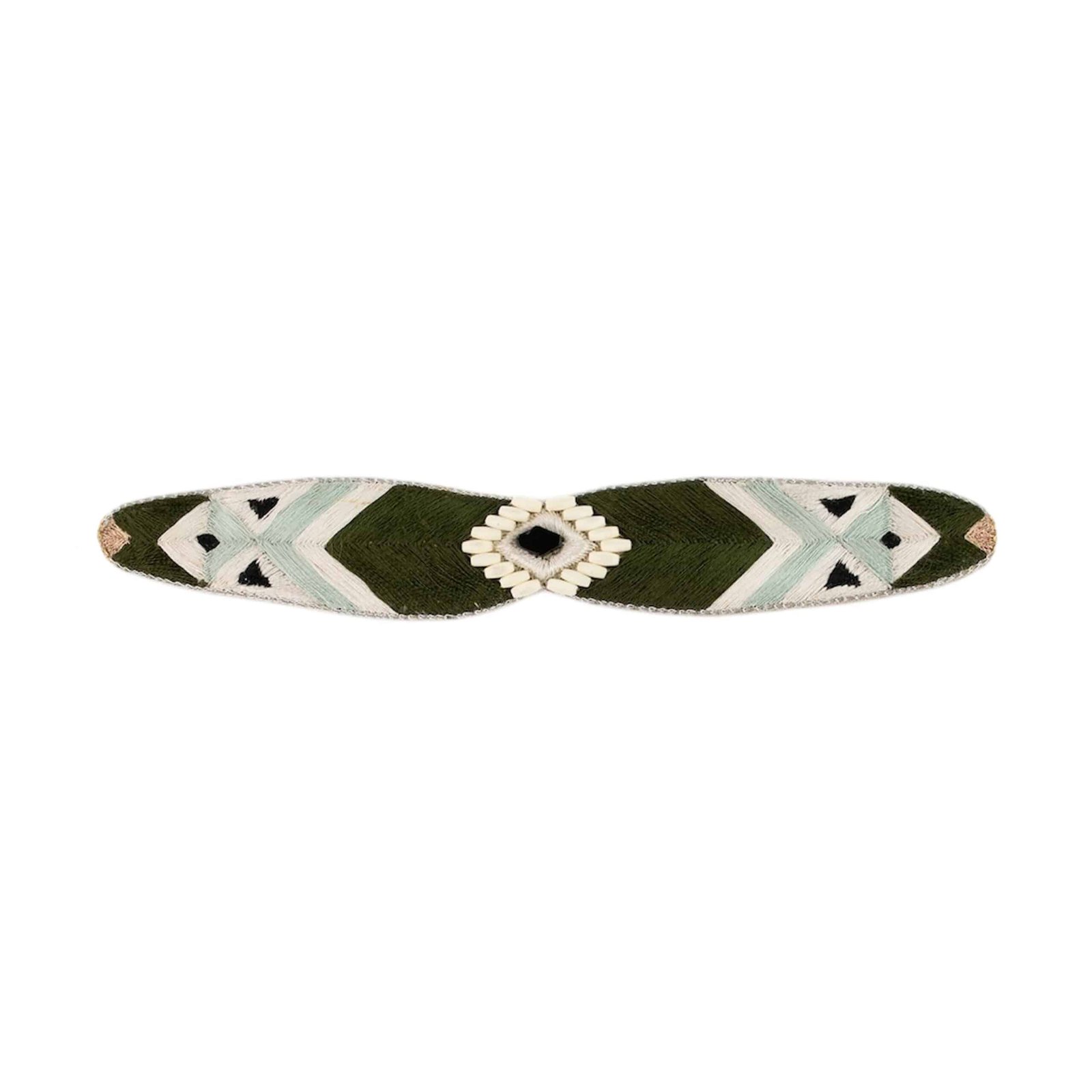 Dans l’esprit des créations Nahua, le choker Navajo combine minimalisme et intensité. Sa forme simple met en valeur la pierre losange et les broderies, tandis que le métal lui confère un caractère affirmé. Porté seul, il habille immédiatement le cou ; associé à d’autres colliers, il crée une accumulation tendance.