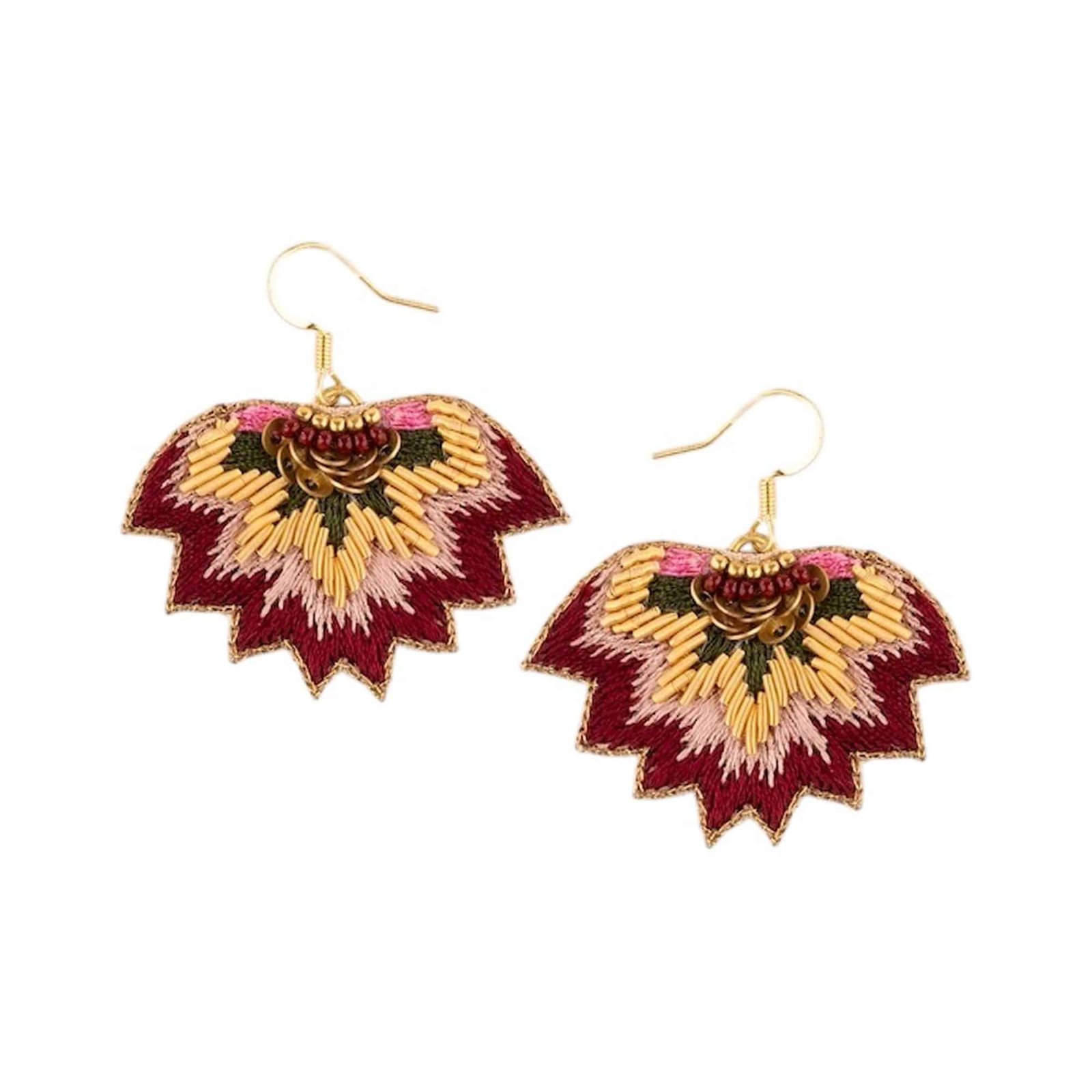 Boucles d’oreilles brodées à la main de fil de soie, de sequins, perles en laiton et perles japonaises. Doublure en cuir souple et crochets en laiton inoxydable et anti-allergène.