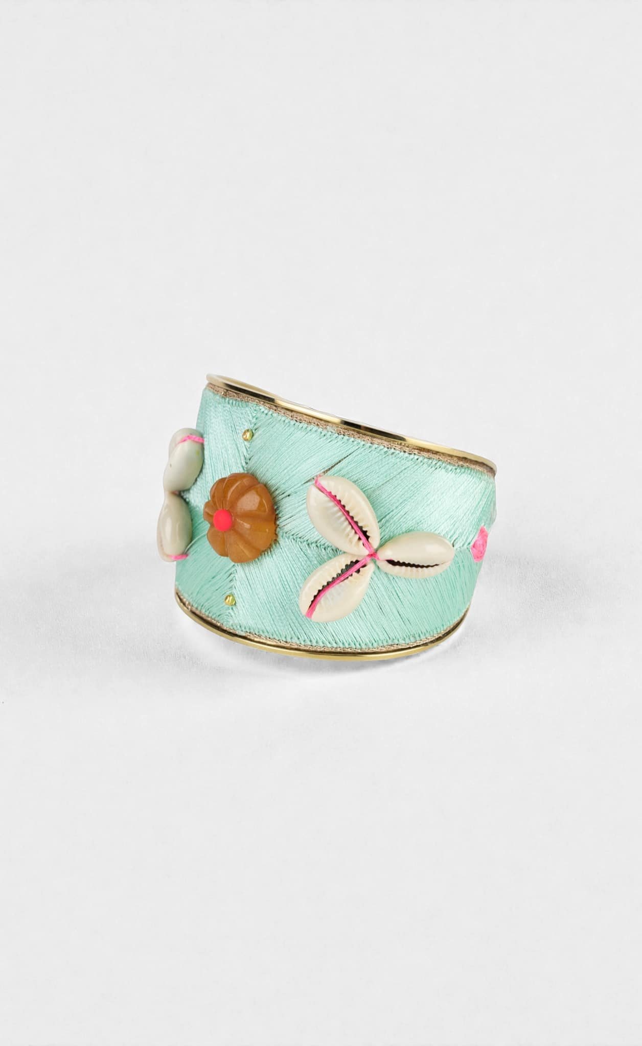La singularité du bangle Nahua réside dans sa surface richement décorée. Là où la plupart des bangles restent en métal brut, Nahua a choisi d’y apposer un travail de broderie manuelle.