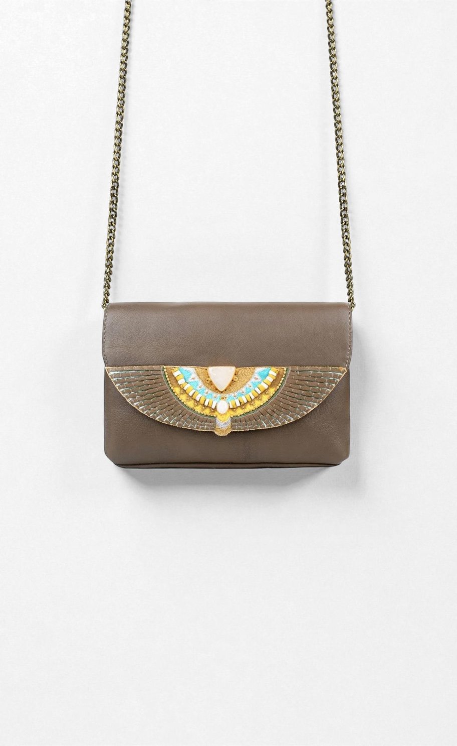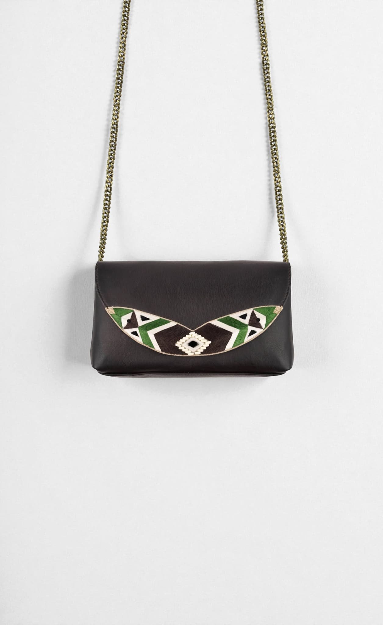 La pochette Nahua se distingue par sa chaîne en laiton travaillée avec soin, qui permet plusieurs styles de port :