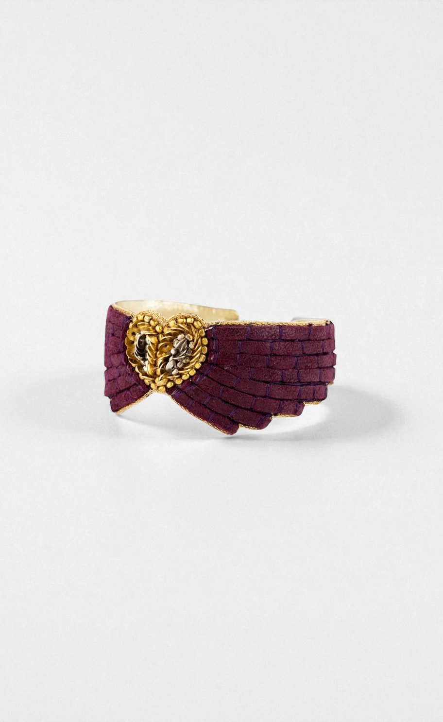 Plus aérien que la manchette, le bangle Ange se distingue par sa forme rigide et son port plus lâche. Contrairement au bracelet ajusté, il flotte légèrement autour du poignet et accompagne les gestes avec fluidité. Brodé sur cuir, il combine la robustesse de la matière à la finesse du travail manuel. C’est un bijou audacieux qui s’adresse aux femmes aimant jouer sur la dualité entre force et délicatesse.