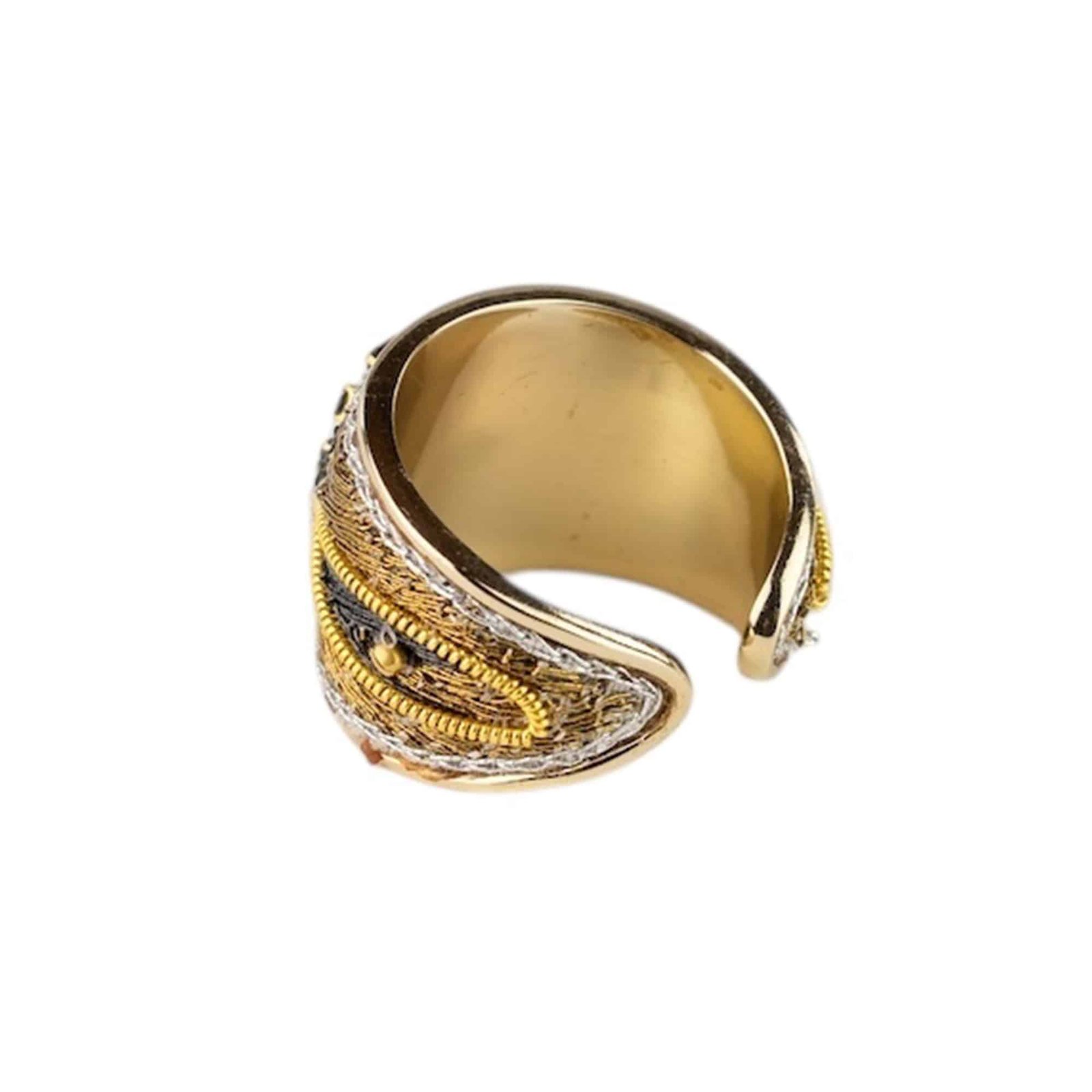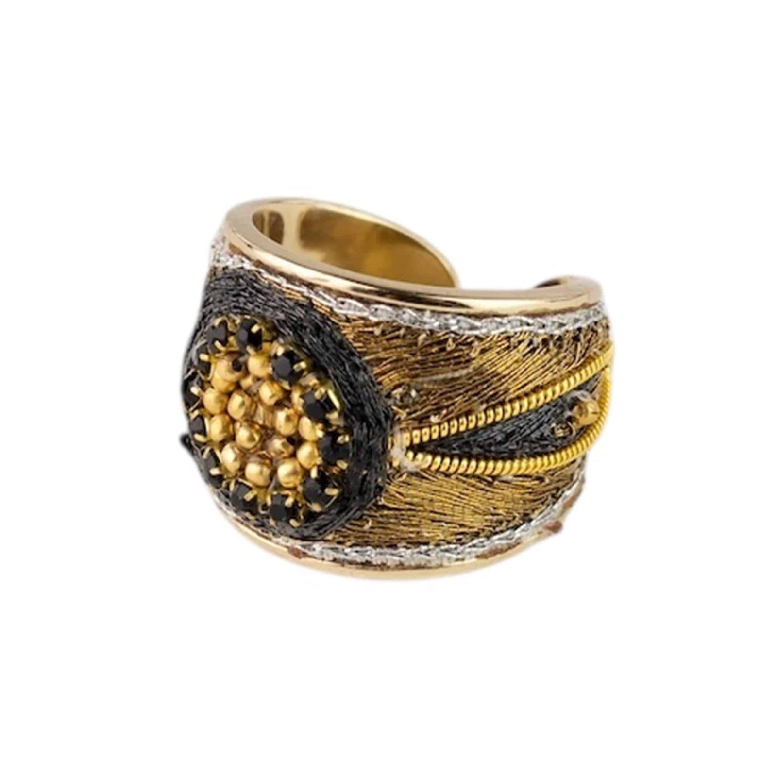 Brass ring with hand-embroidered applique of metallic thread, brass beads and rhinestones. Slightly adjustable by pressure.