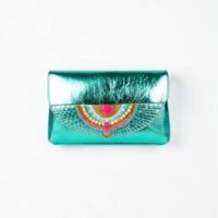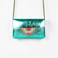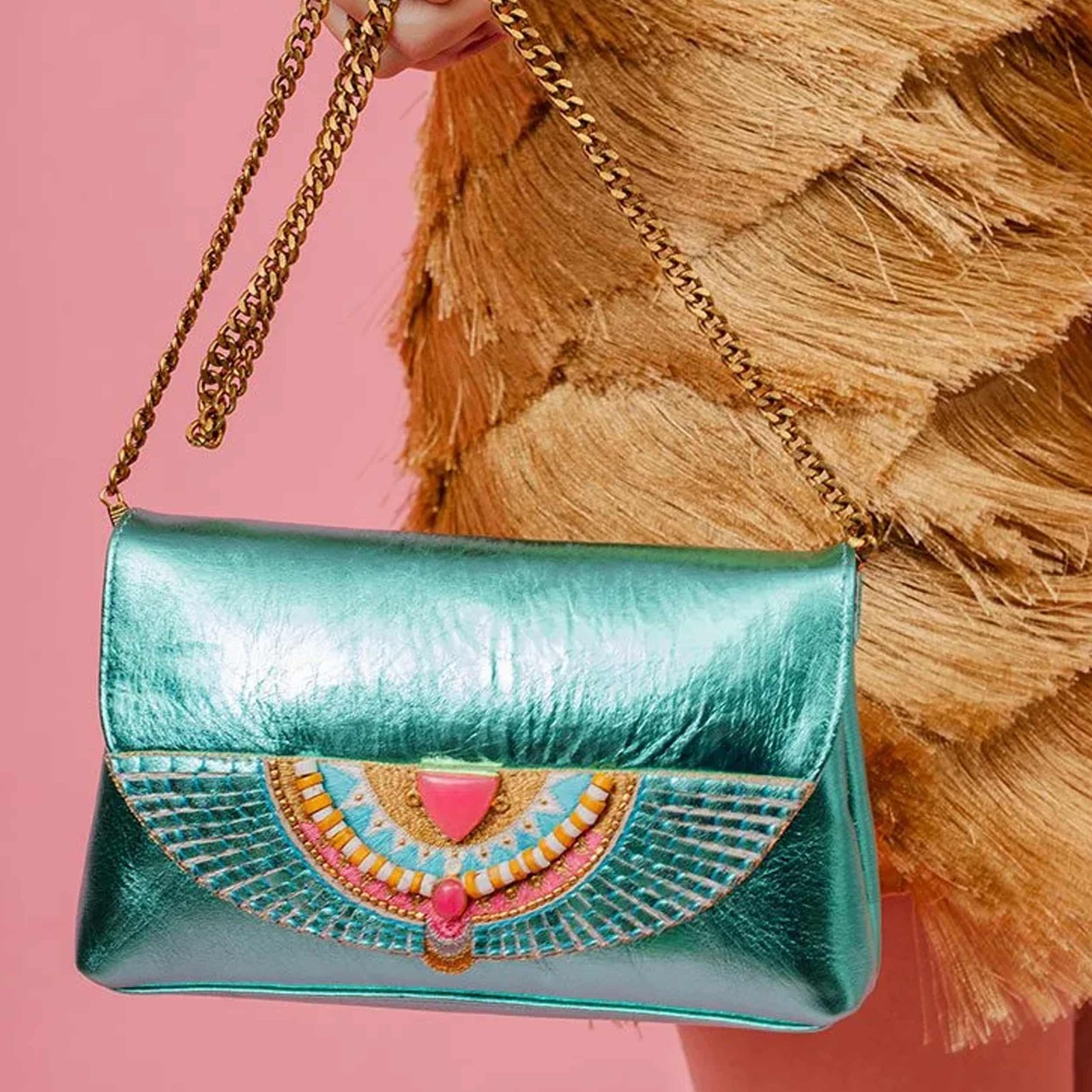 Hand-embroidered clutch bag in silk thread and leather straps, set with semi-precious stones and brass beads. Leather base, fabric interior, stainless steel and anti-allergenic brass chain.