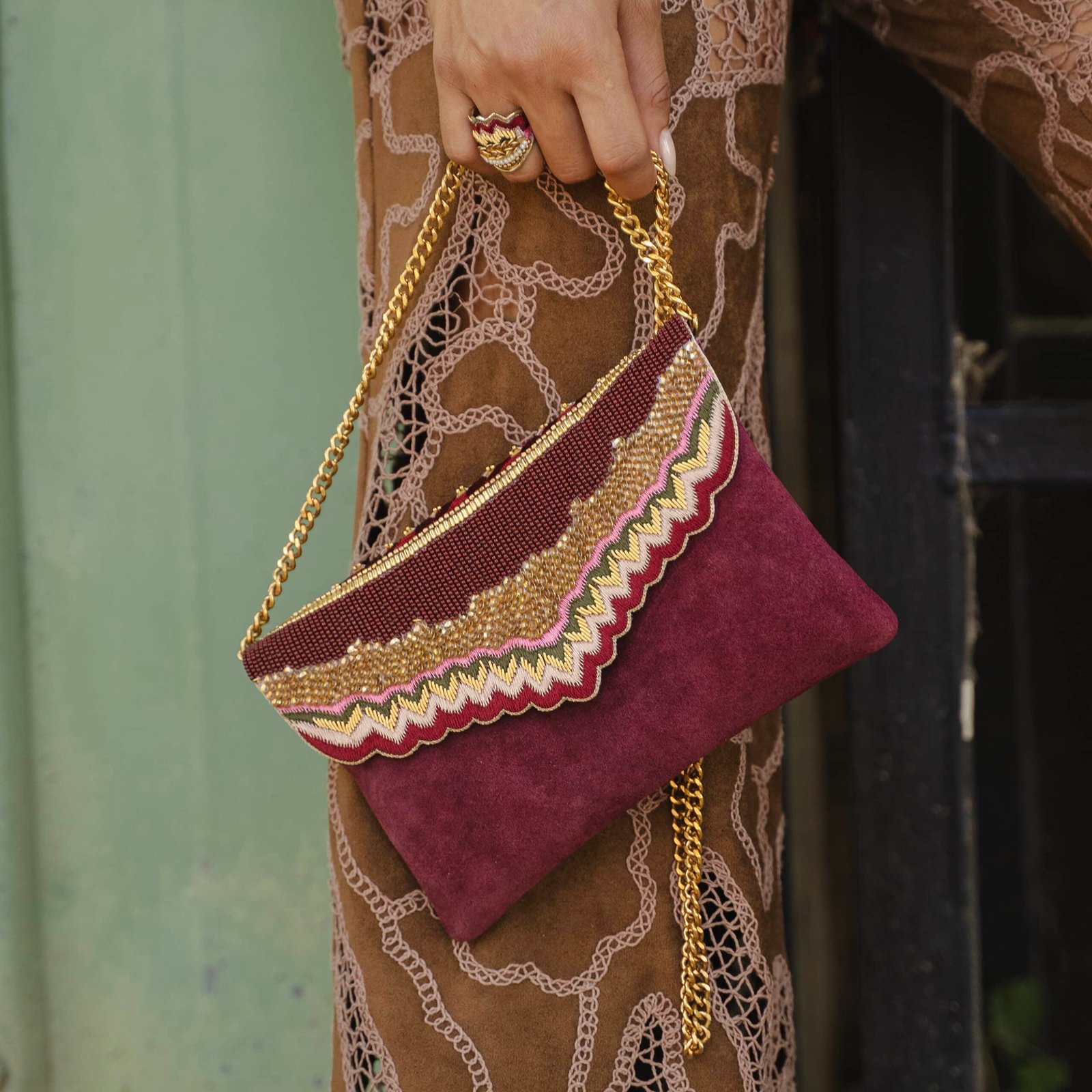 All our products are handmade using leather, silk thread, sequins, and other semi-precious beads. It is important to avoid contact with water (saltwater or chlorinated water), detergents, oils, cosmetics, alcohol, chemicals, and acids.