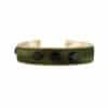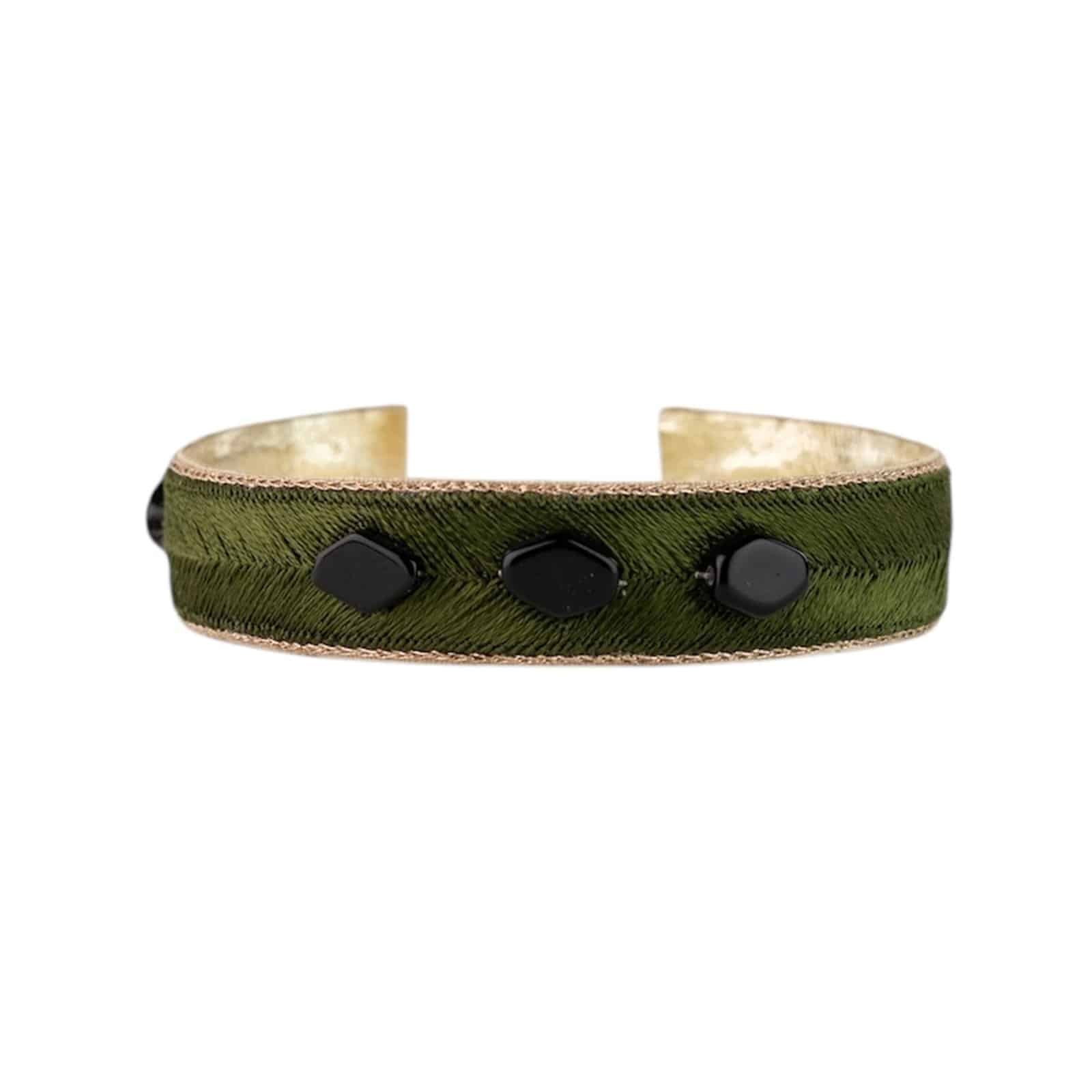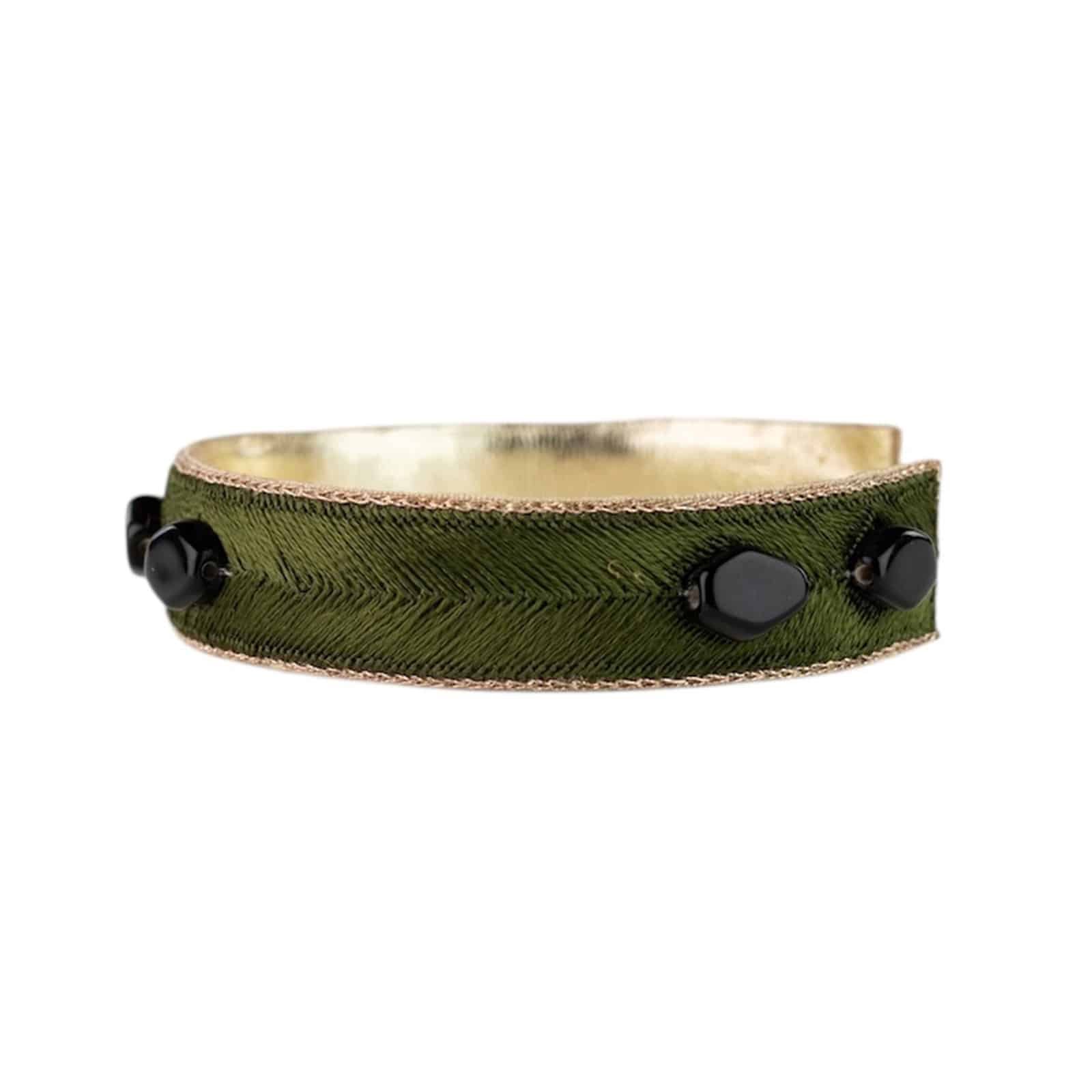 Hand-embroidered bangle. Semi-precious beads. Soft leather lining. Adjustable snap fastener.