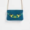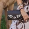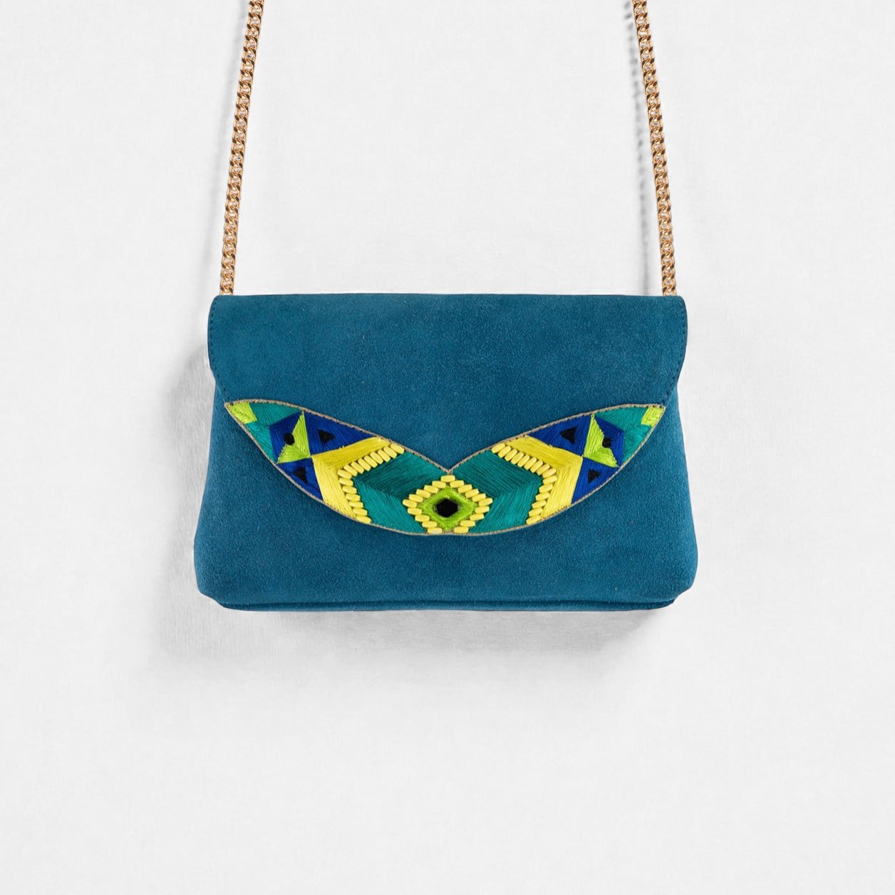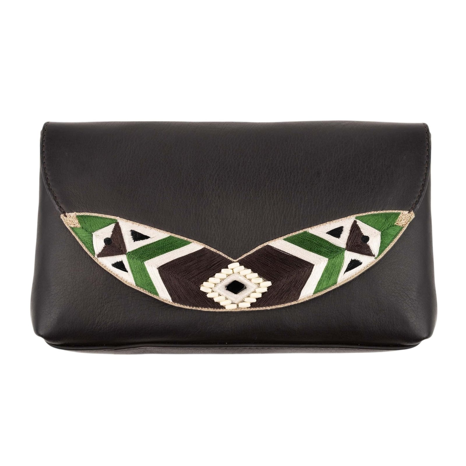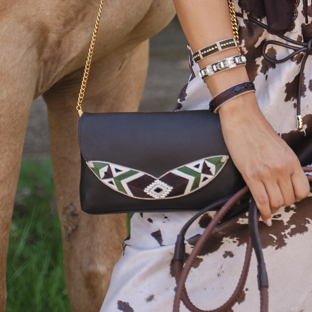 • Hand embroidered • Leather and silk thread • Semi-precious stones and brass beads • Leather base and fabric interior • Stainless steel and anti-allergy brass chain