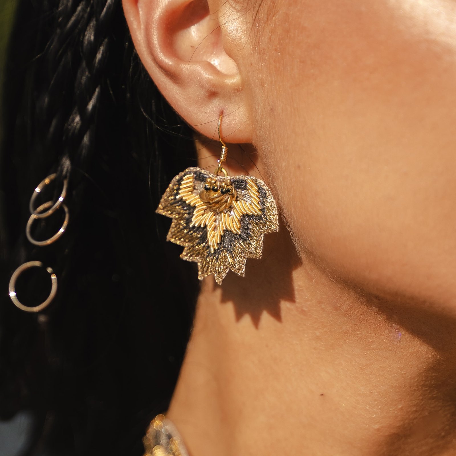 Boucles d'oreilles (earrings) brodées à la main de fil de soie avec au centre un cœur en laiton coloré en vert. Attaches en laiton inoxydable et anti-allergène.