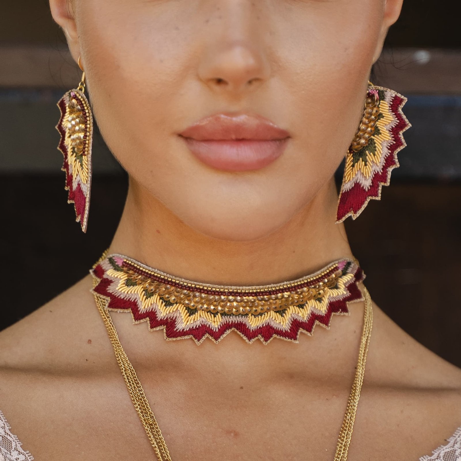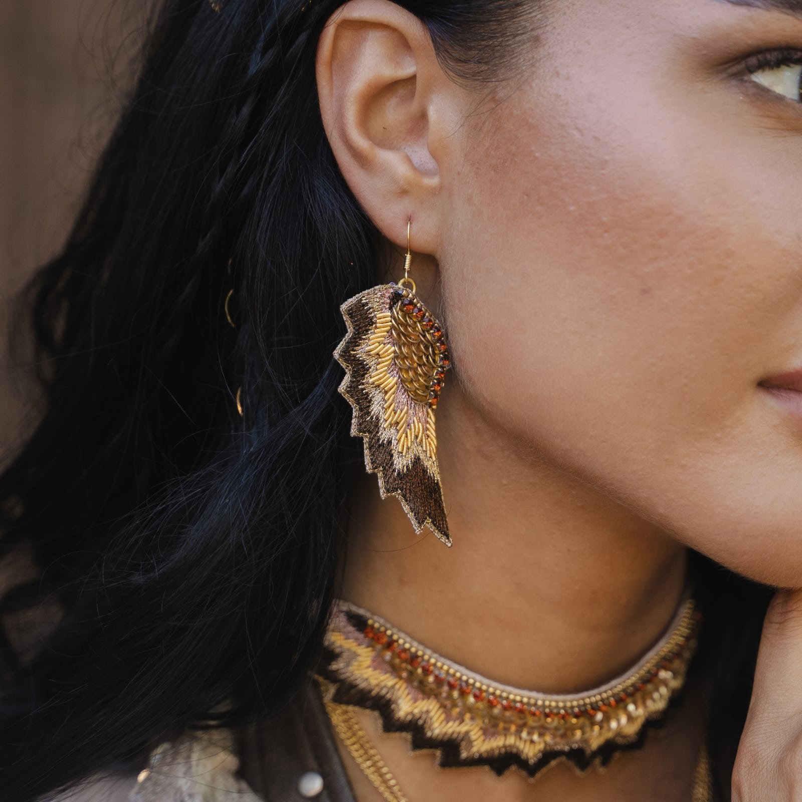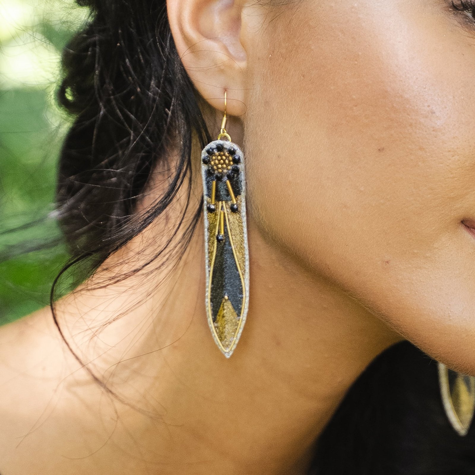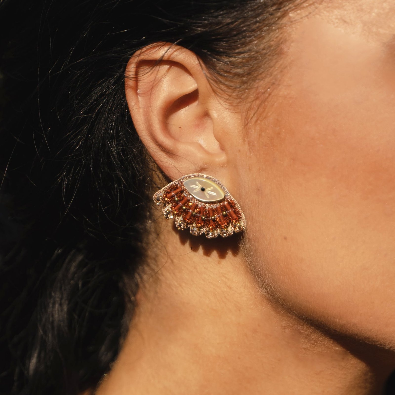 Boucles d'oreilles (earrings) oeil, brodées à la main de fil de soie vert, blanc, corail et noir avec strass et larmes en laiton. Attaches en laiton inoxydable et anti-allergène.