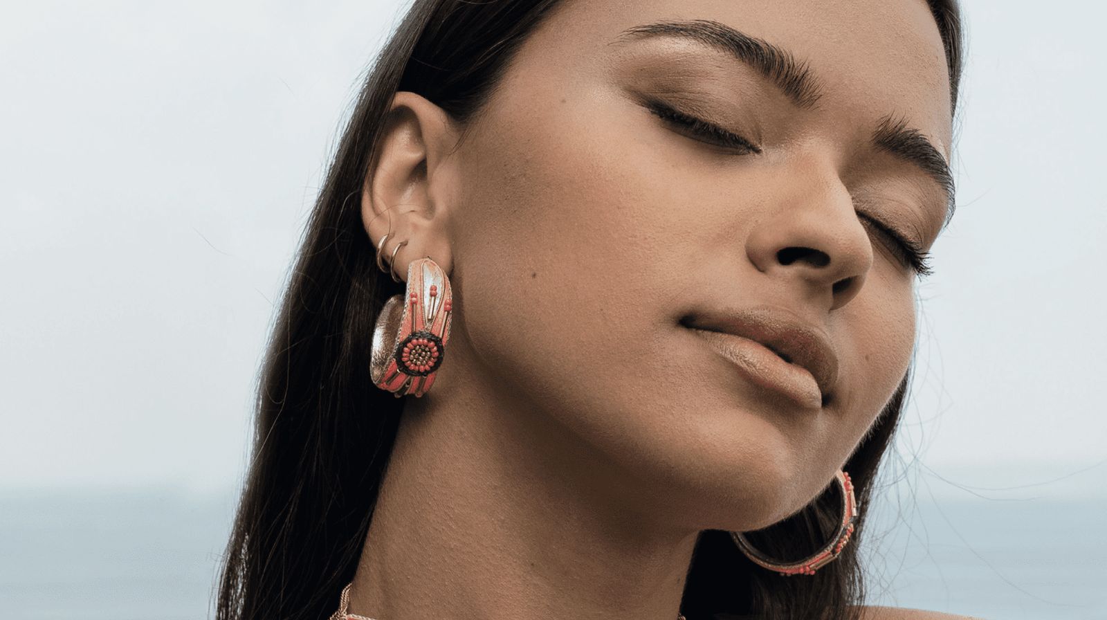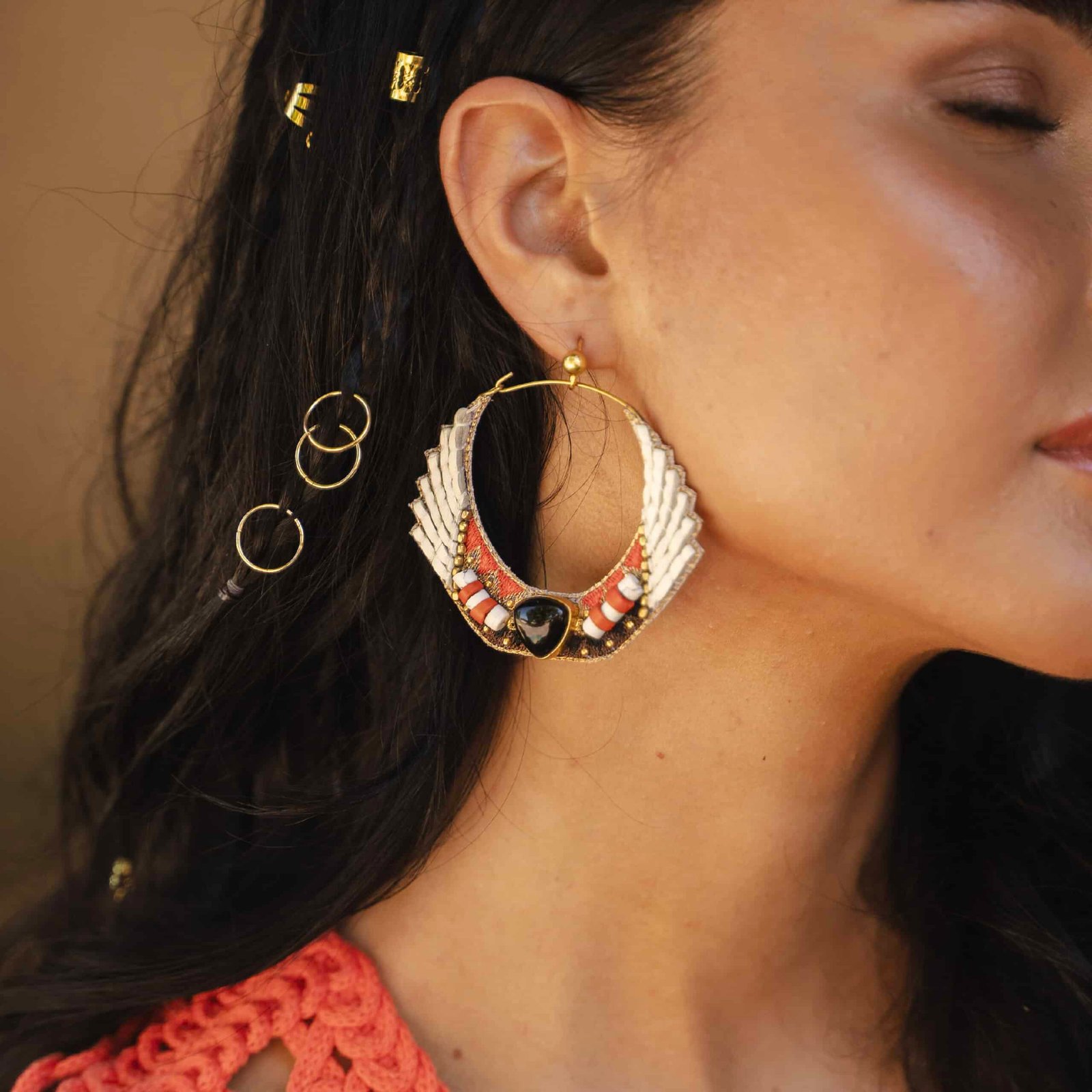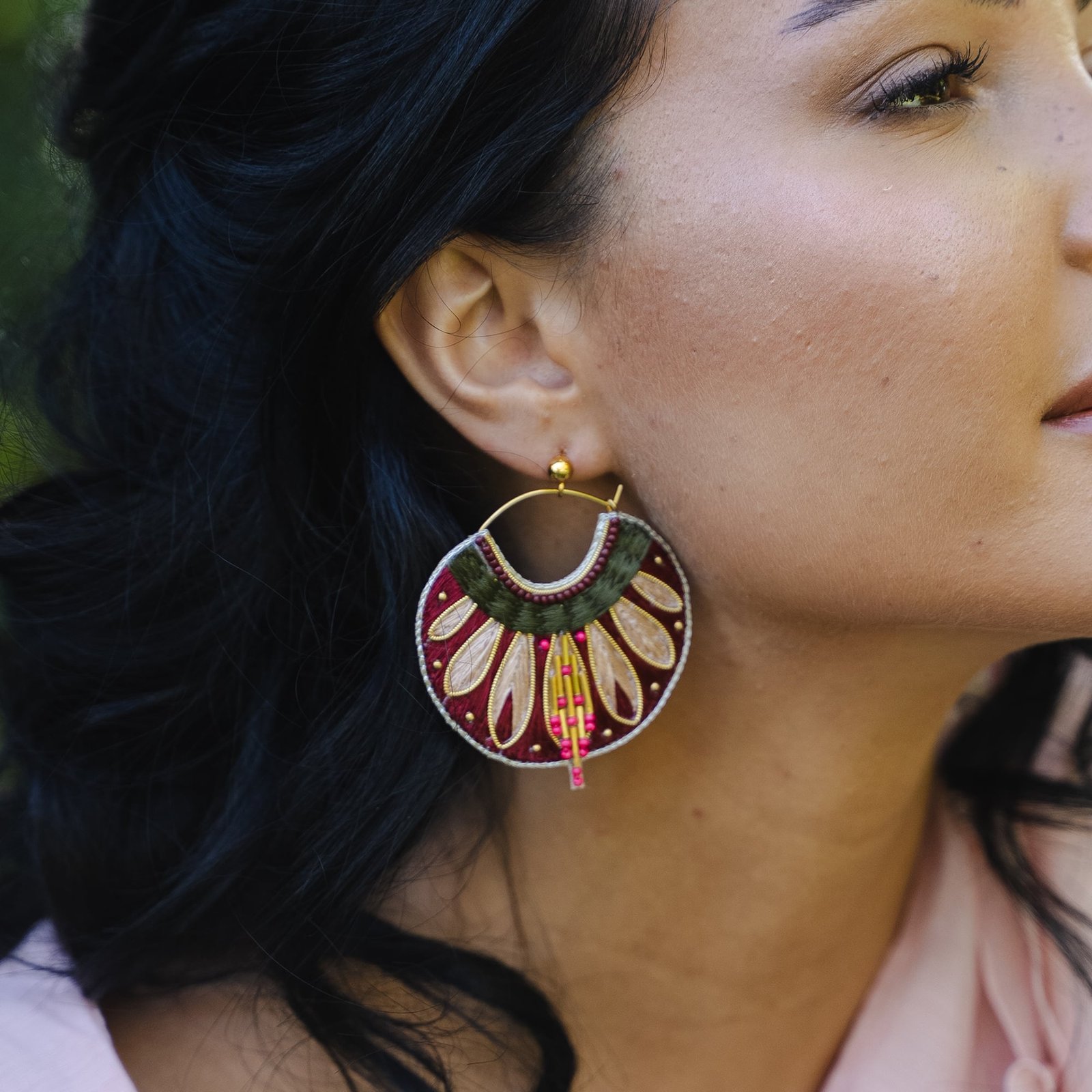 Boucles d'oreilles créoles (hoops) brodées à la main de fil de soie couleur jaune, rose et rouge. Perles en laiton et attaches en laiton inoxydable et anti-allergène.